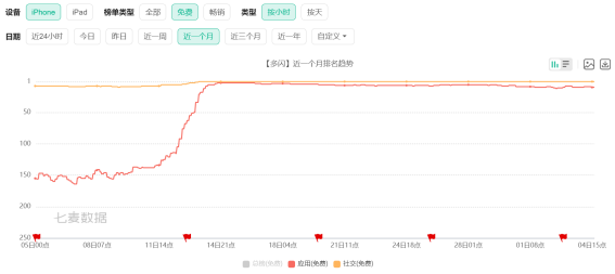 此前,多闪在App Store的下载量排名起起伏伏,长期在总榜一百名开外徘徊。此次排名飙升,与抖音加大了对这款命运多舛的APP的推广有关。