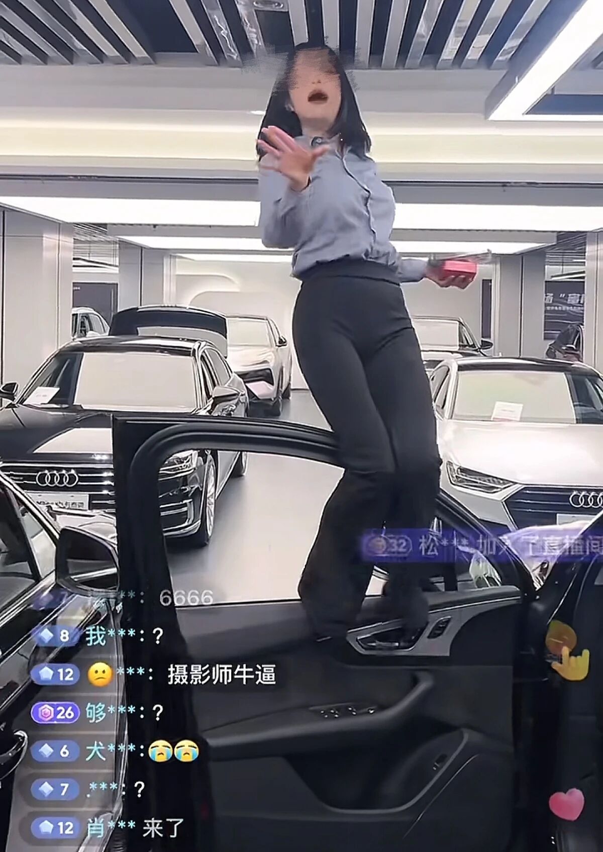 比如奥迪某4S店内,小巧玲珑的主播一言不合就开跑,用各种姿势丝滑入车的她,上一秒可能还在主驾驶位,后一秒已经跳进了后备厢。