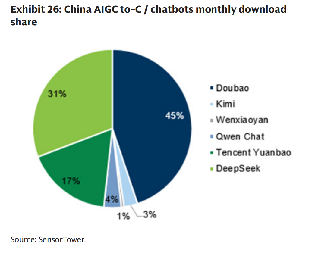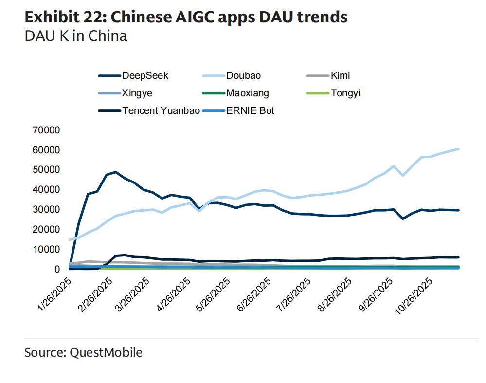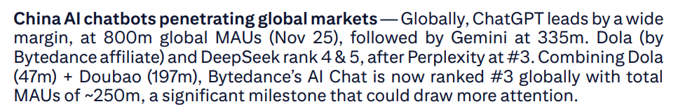 豆包也在一骑绝尘。根据花旗的报告,如果将豆包海外版(Dola)用户合并,字节跳动旗下AI聊天产品的总MAU将达到约2.5亿,全球排名超过PerPlexity成为第三。这也仅次于ChatGPT(月活8亿)、Gemini(月活3.35亿)。