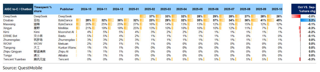 根据Questmobile数据,截止2025年10月,豆包在国内C端语音大模型领域的用户时长份额已经达到45%,为有记录以来最高,通义(千问)的市占率接近于0,腾讯元宝为5%。8个月之前,DeepSeek横空出世,彼时豆包的市占率一度被挤占到仅剩23%。