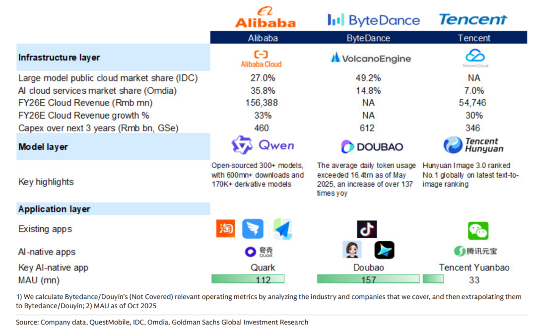高盛在最新一期的中国互联网分析报告中指出,阿里巴巴在企业端(To-B)外部AI云收入整体规模上领先,具体市占率达到35.8%,字节跳动为14.8%,腾讯为7%(均为外部AI云部分)。