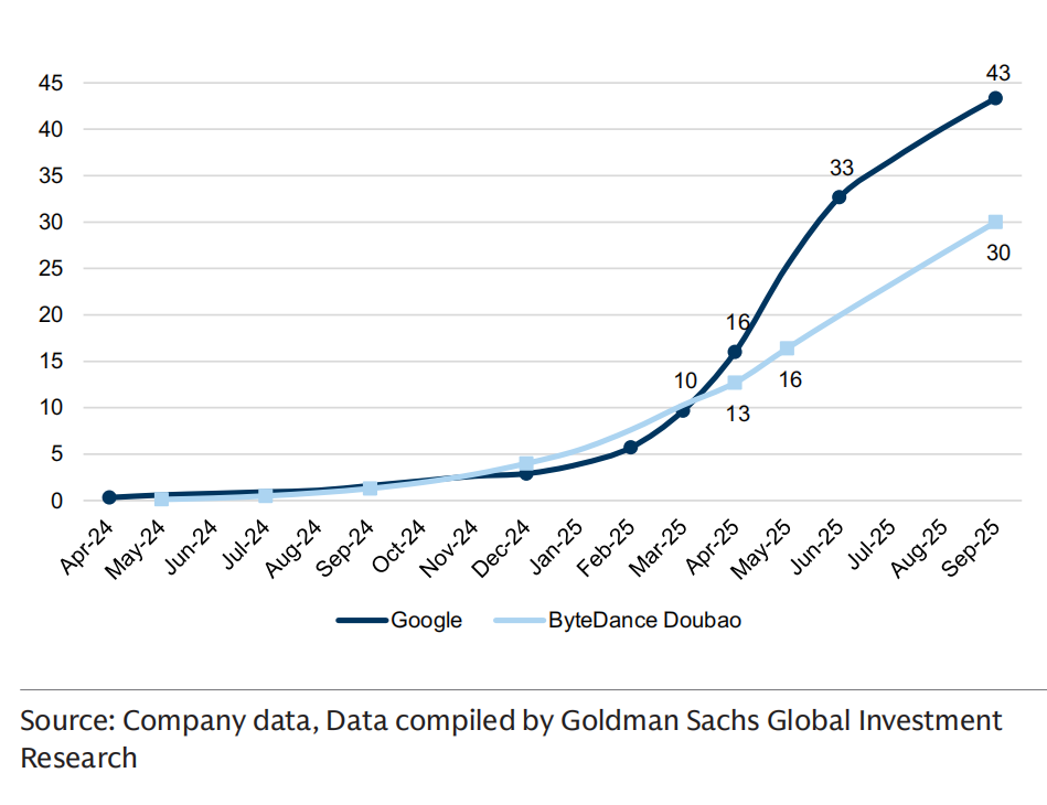 同样根据高盛的研报,其引用IDC的数据指出,在反映大模型云服务的日均token使用量这一数据上,字节跳动今年9月份已经来到30万亿级别,这是什么概念呢,全球日均token使用量最高的公司是Google,它是43万亿,国内的百度、DeepSeek都是十万亿级别,在这一决定AI云未来的关键细分市场,字节跳动的市占率达到了49.2%,而阿里的占比是27%。