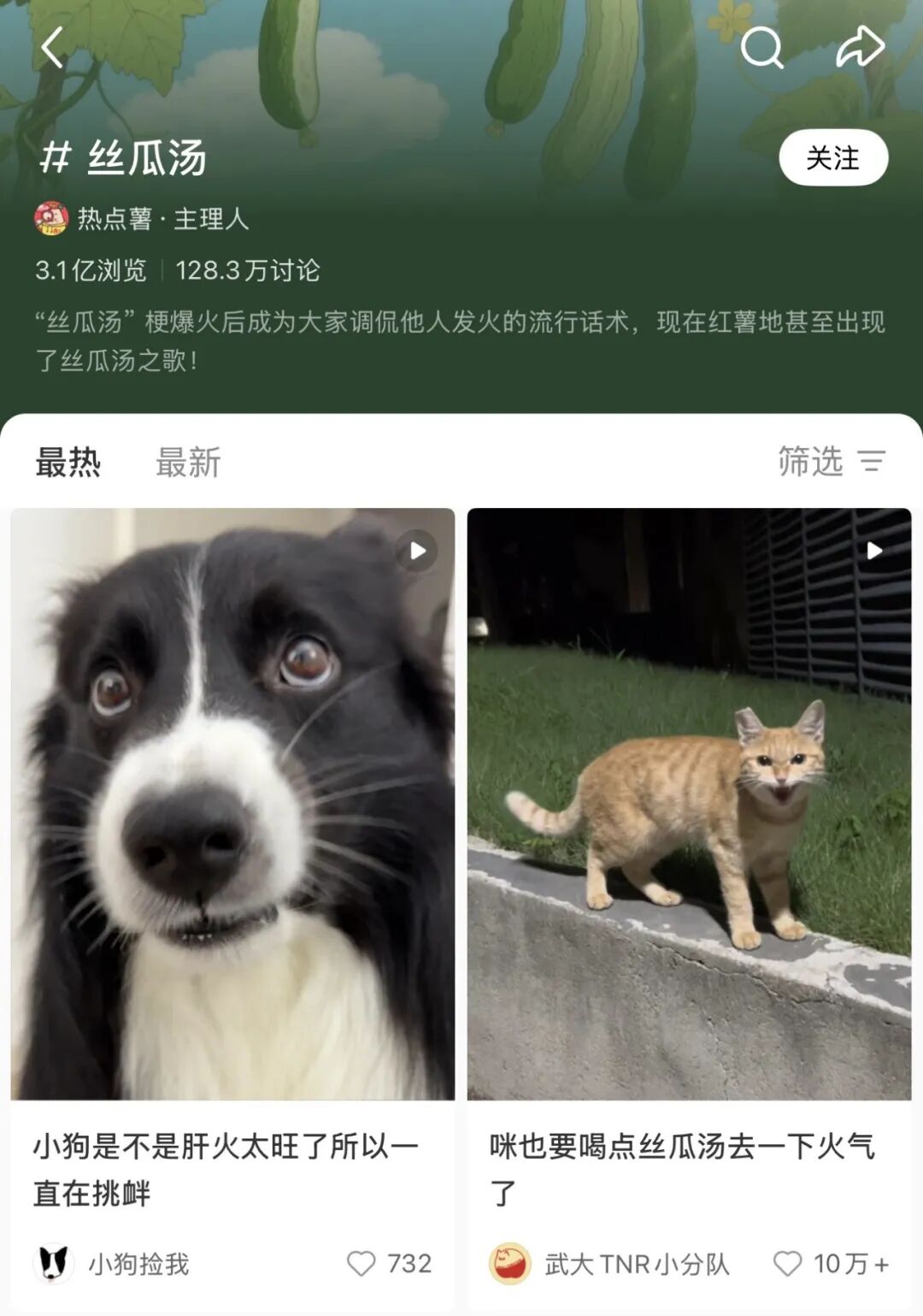 小红书上,#丝瓜汤 的话题超过了3亿浏览和128万讨论,甚至出现了丝瓜汤之歌。有人分享自己被安慰的经历,有人创作相关的表情包,还有人真的去研究丝瓜汤的做法。而在微博上,这个梗更是成了万能安慰语。无论是失恋、失业还是考试失利,总有人会在评论区留下一句:喝碗丝瓜汤吧。