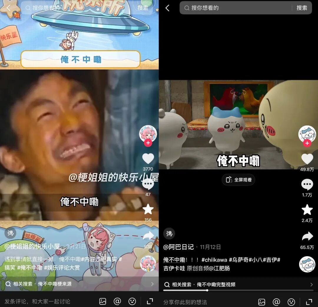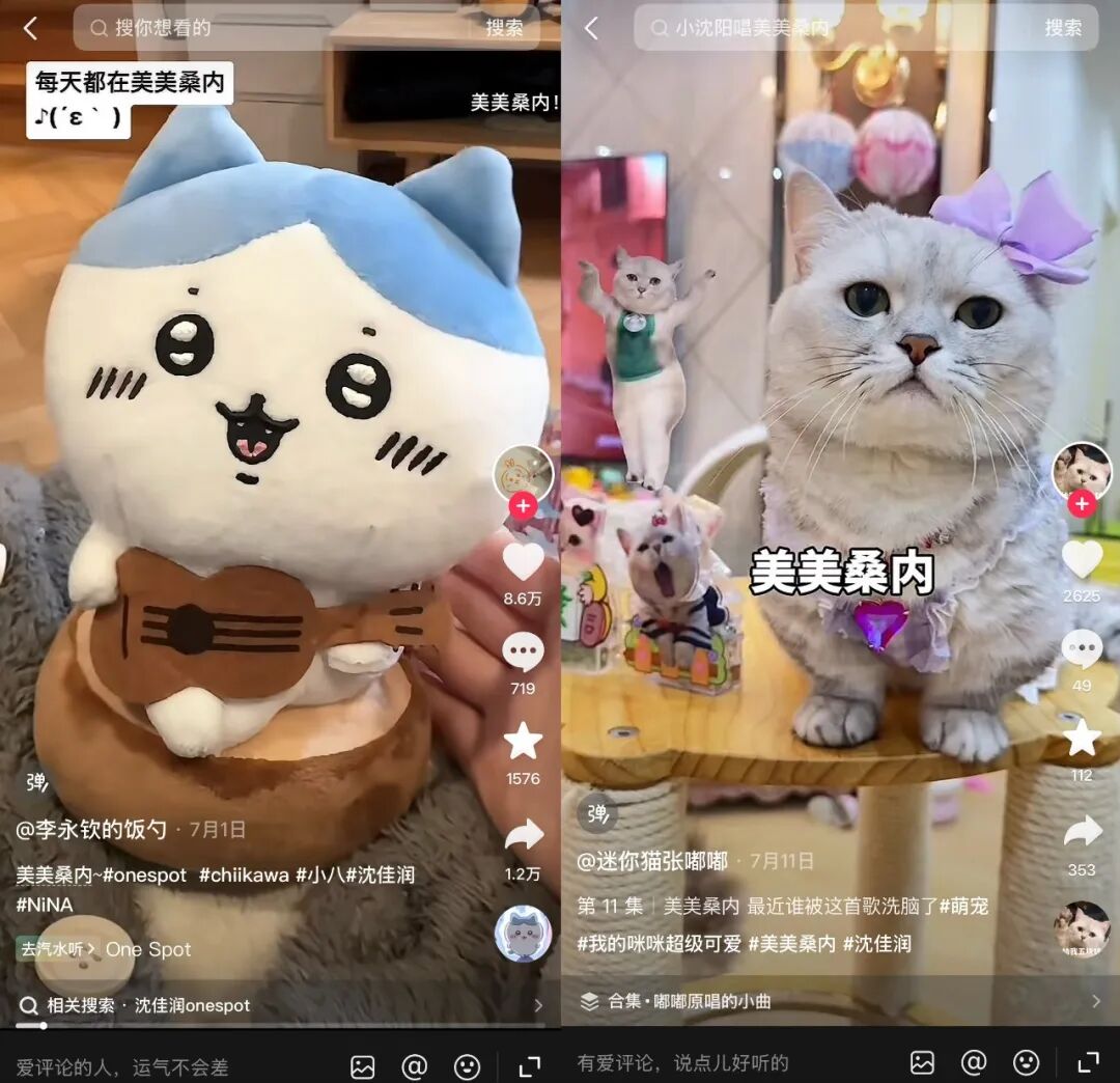 在抖音上,这个梗更是成了万能BGM,无论是什么内容,只要配上美美桑内的音效,点赞量就会蹭蹭往上涨。