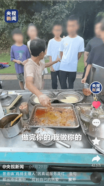 这个热梗说的正是景德镇的“鸡排哥”,一个炸鸡排的小摊,硬是被他干出了主理人的气场。