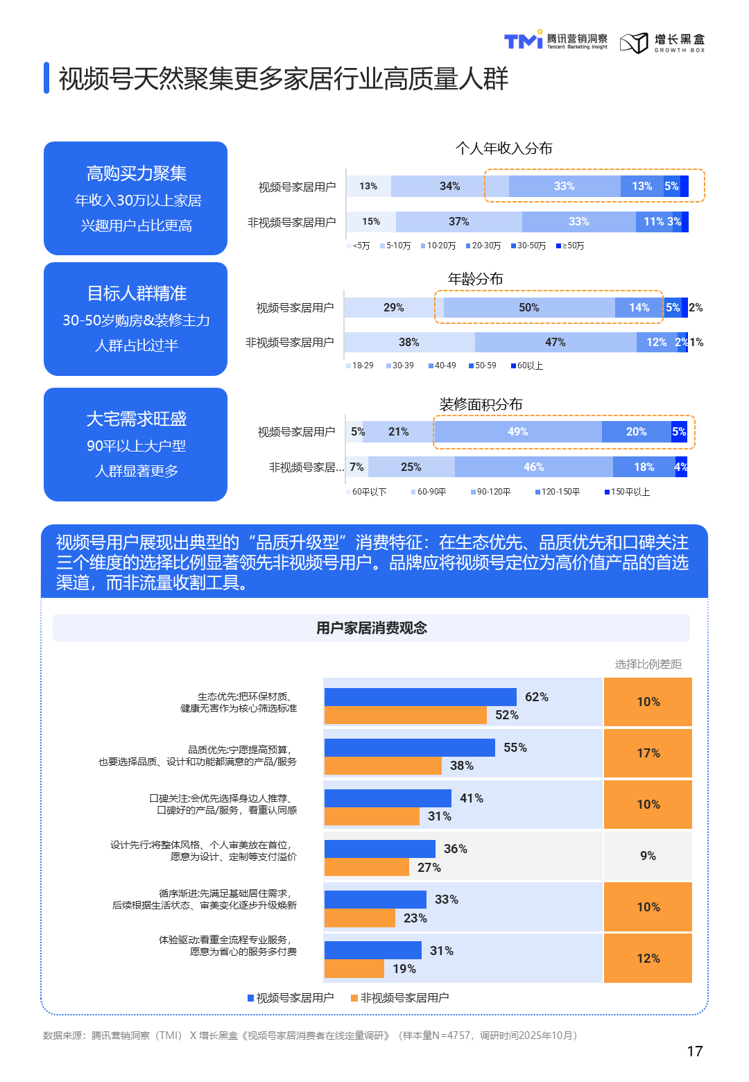 调研画像显示,视频号的家居兴趣人群呈现出明显的高产、大宅特征。相比非视频号用户,这群人不仅收入更高,而且对生活品质有着更为严苛的要求。