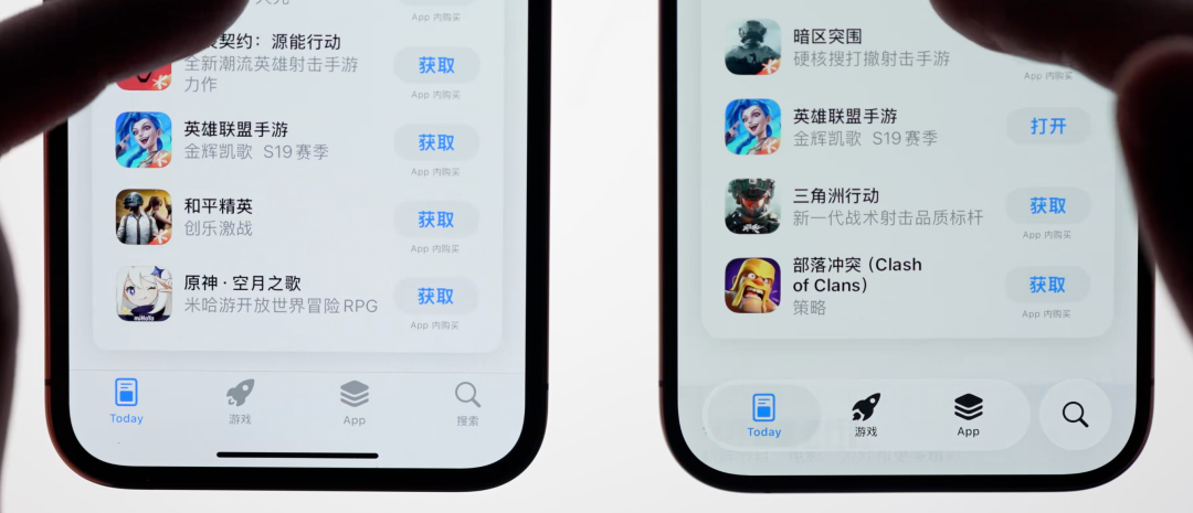 灵动岛和Liquid Glass的设计,还有两个值得关注的亮点:一是按钮不再有固定底栏和顶栏遮挡内容,悬浮于内容之上,更贴合全面屏的视觉感受;二是底栏图标及圆角与机身呈同心圆位置,无需App单独做UI适配,由系统统一实现,这一点安卓无法复制,鸿蒙虽能学到软件层面,但因硬件圆角不统一,意义不大。