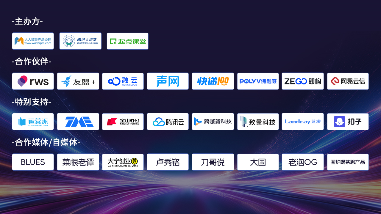 感谢RWS、友盟+、融云、声网、快递100、保利威、即构、网易云信等合作伙伴的大力支持。