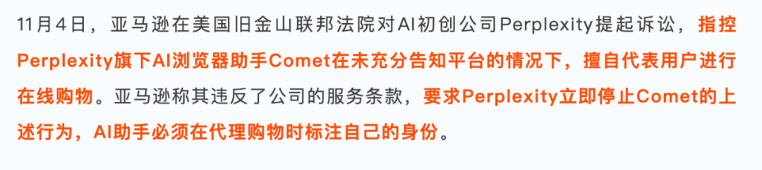 亚马逊起诉 Perplexity,指控其 AI 助手Comet在未披露身份的情况下代表用户在亚马逊平台购物,违反服务条款。