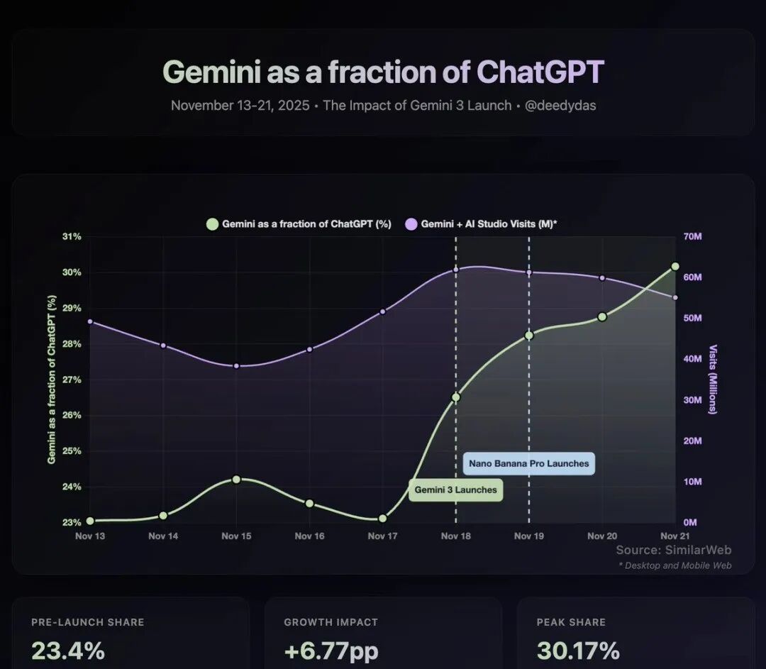 最近被马斯克和 Sam Altman 点赞的 Gemini 3 的用户数据快速增长,很形象的表明了这个趋势。