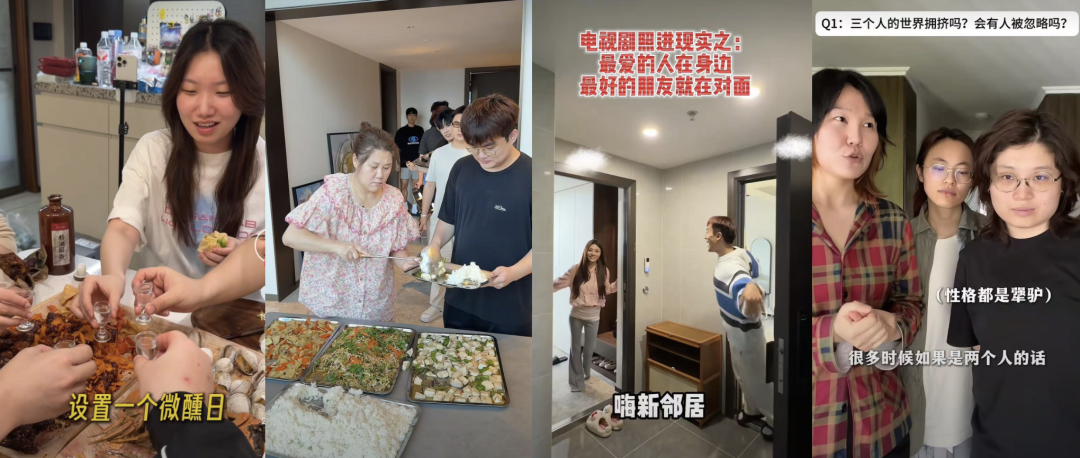 随着群居题材升温,各路网红都开始向其靠拢。普遍做法是和朋友租住在一个小区,隔三差五去对方那里串门。“自嗨姐妹”的依然在结婚后,仍带着男闺蜜杨俊豪一同生活,惹得粉丝直呼感动。河马君、万宁叔夫妇、九呵呵等博主的“团建”现场,也总能卷起流量洪流。