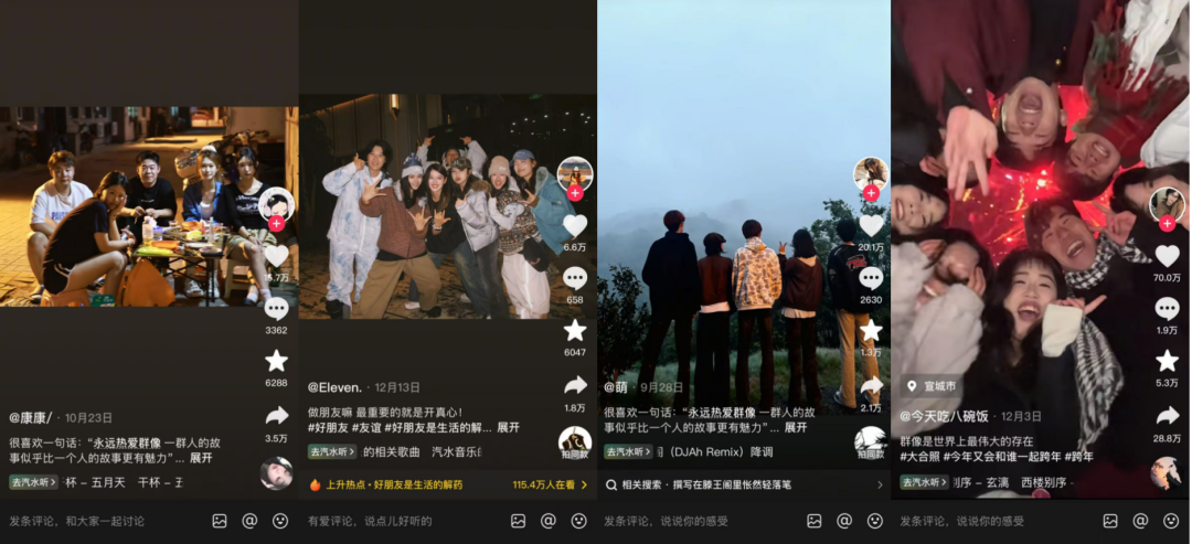 大网红们一起玩、互相输送流量已不新鲜,值得注意的是,越来越多素人正在关注和记录群像,试图过上类似《老友记》《爱情公寓》那样的集体生活。“我不羡慕你们的人生,我羡慕你们有这样的朋友”承载了当下的社交欲望。