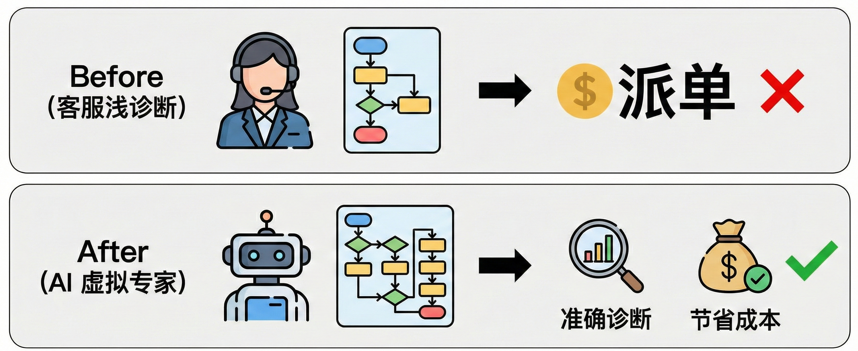 我们的客服在判断设备是否故障时,受限于经验,通常只看4 个步骤就会派单;实际上,真正的技术专家通过日志排查需要看12 个步骤,客服的“浅诊断”导致了大量无效的工程师上门,每一单都是实打实的真金白银;