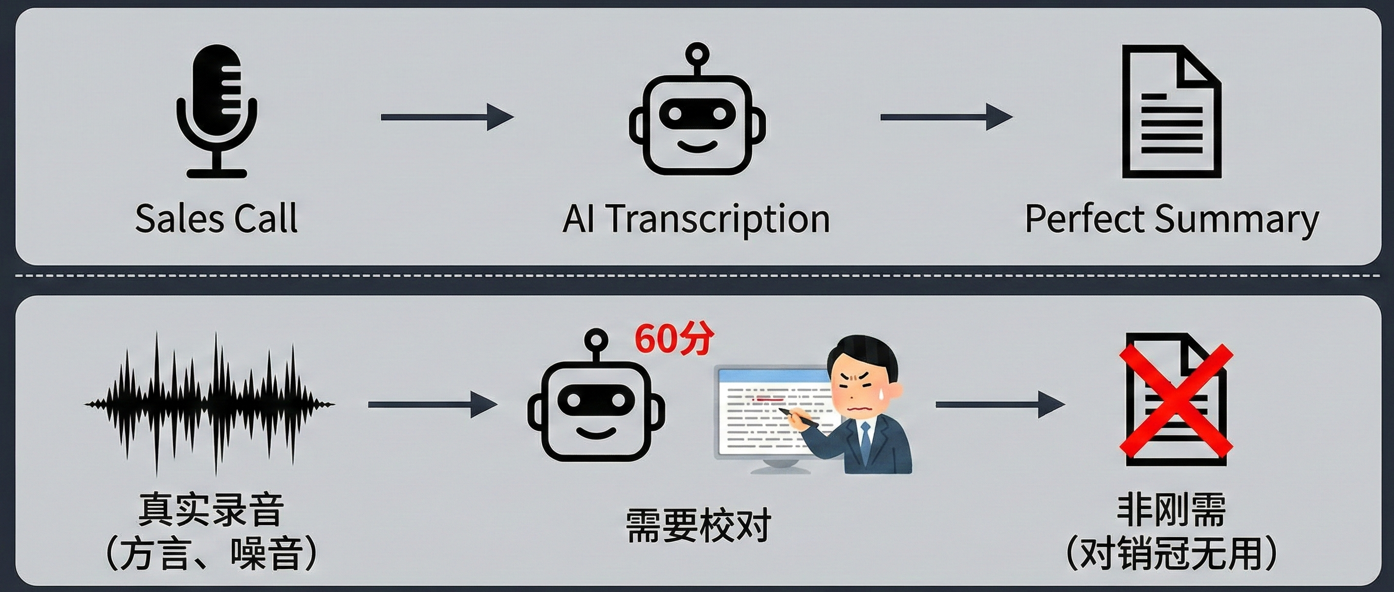 - 数据源太“脏”:真实录音充满了方言和噪音,AI 生成的准确率只有 60 分,销售反而需要花更多时间去校对;