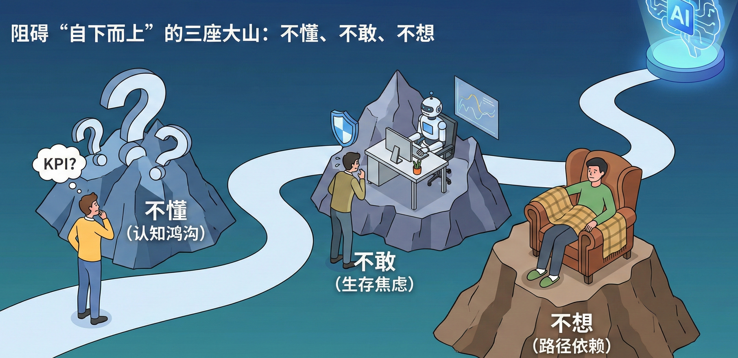 很多管理者认为员工不用 AI 是因为“懒”或“笨”,这个归因太傲慢了;在与HRD的深度交流中,我总结了阻碍“自下而上”推行的三座大山:不懂、不敢、不想。