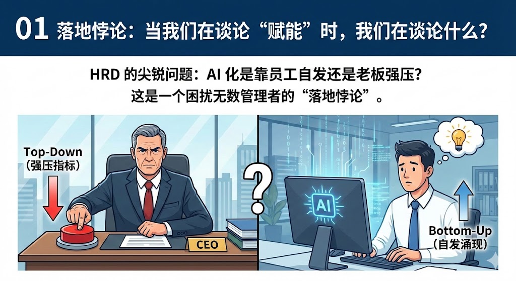 最近年底做预算复盘,HRD 问了我一个非常尖锐的问题:“万劲,明年组织要全面 AI 化,到底是该指望员工自发涌现创意(自下而上),还是靠老板强压指标(自上而下)?”