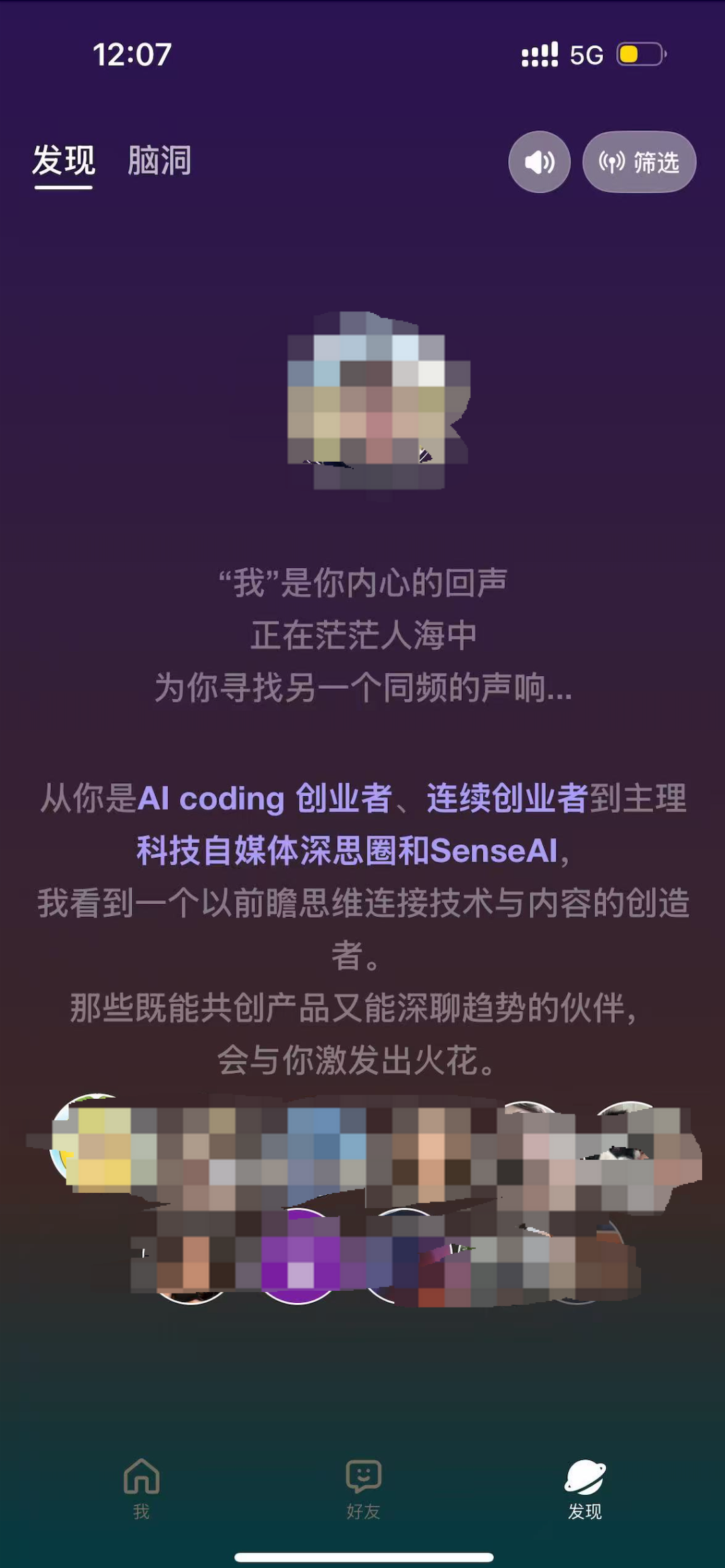 在 1.1 版本的”发现”页中,匹配也进行了升级。你不再是搜”25岁、爱运动、北京”,而是可以告诉 AI:”我想认识一个对 AI coding 非常感兴趣且有 hands-on 经验,底层价值观和我很一致的人。”