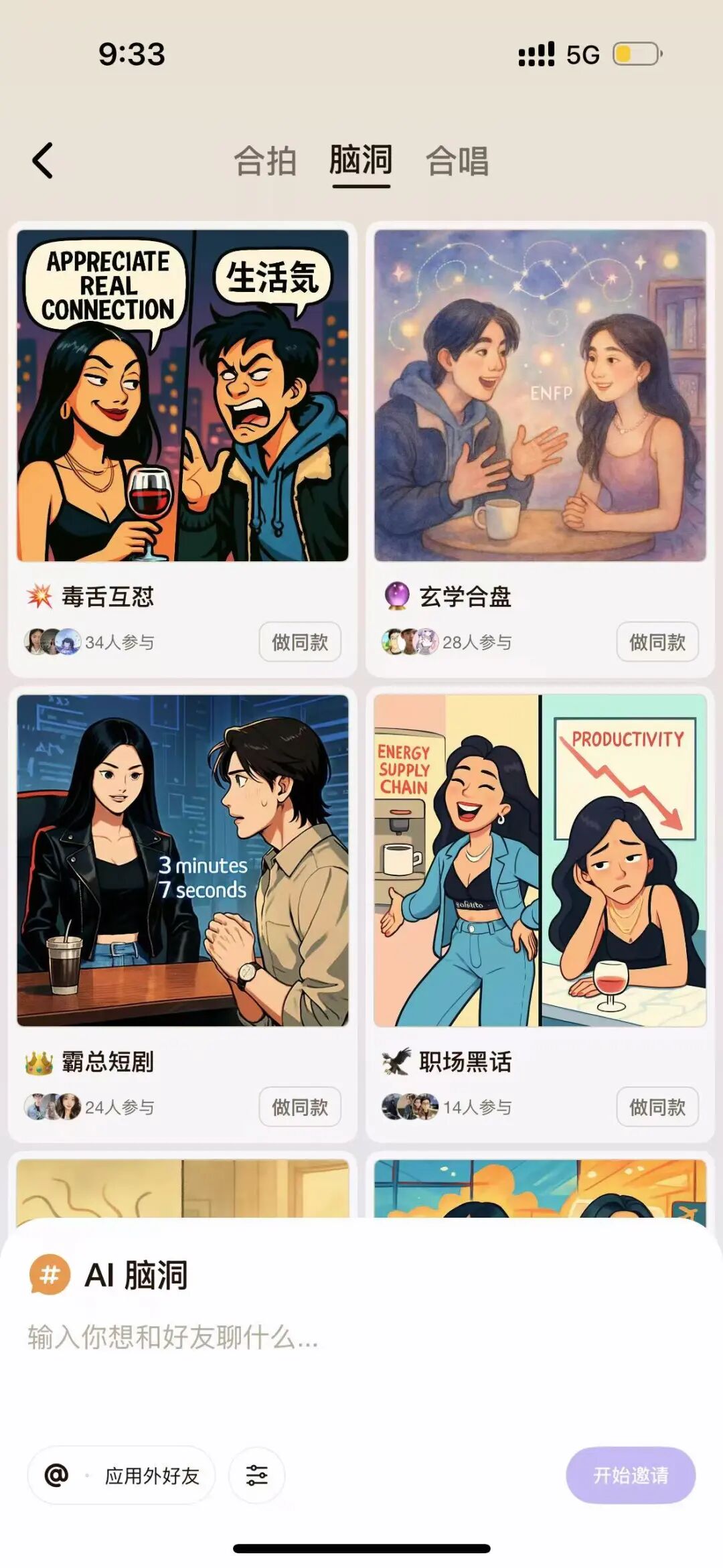 你可以拉上朋友的 Second Me,用 AI 一起吐槽老板、合拍带有你们特征的卡通表情包,甚至一起来 Rap battle。
