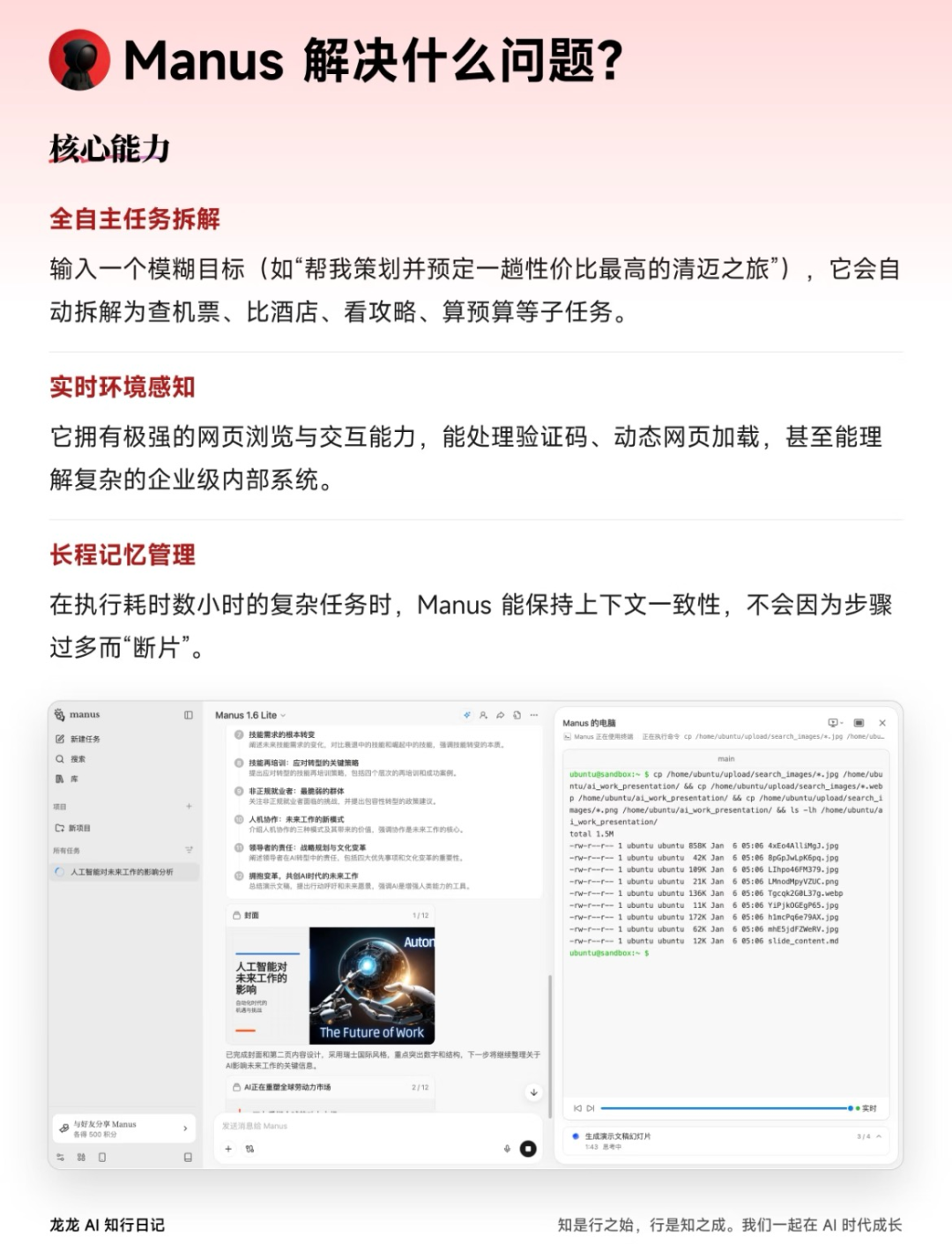 过去这几年,公众对AI的认知大多停留在“内容生成”——写文案、作图画、答问题。业内讨论的焦点,正从“AI能生成什么”转向“AI能完成什么”。这意味着,衡量AI价值的标准,不再是其回答或创造内容的精巧程度,而是它能否像一名可靠的员工那样,理解目标、拆解步骤并最终交付一个完整的工作成果。未来的AI将不再只是为你起草一份商业计划书,而是能自动协调数据调研、竞品分析、财务预测乃至PPT制作的全过程。
