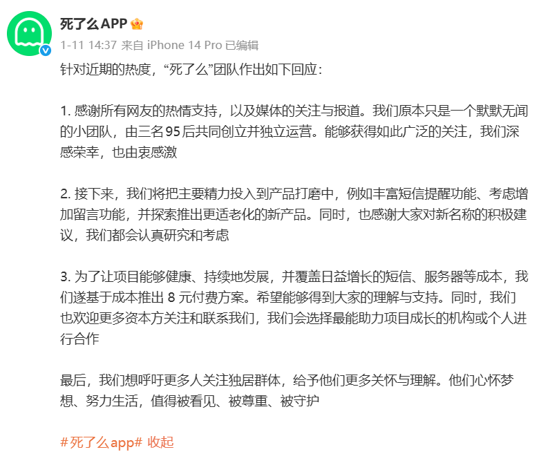 从免费到1元,再到8元,“死了么”APP不断涨价,但为之付费的用户反倒越来越多,很多用户一边骂着“名字晦气、膈应”,一边还是决定花点小钱试试水,因此使得“死了么”APP的热度居高不下。1月11日,“死了么”团队在微博上针对近期的热度作出了回应,表示接下来将把主要精力投入到产品打磨中,例如丰富短信提醒功能、考虑增加留言功能,并探索推出更适老化的新产品。