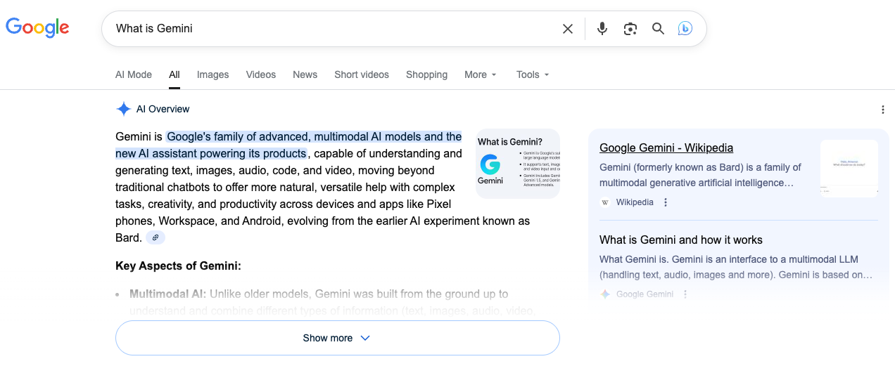 这是现在 Google 搜索的默认形态。过去,我们需要自己点开多个网页、反复对比、手动提炼信息;而现在,AI Overview 会直接帮你把相关网页通读一遍,然后给出一段总结。