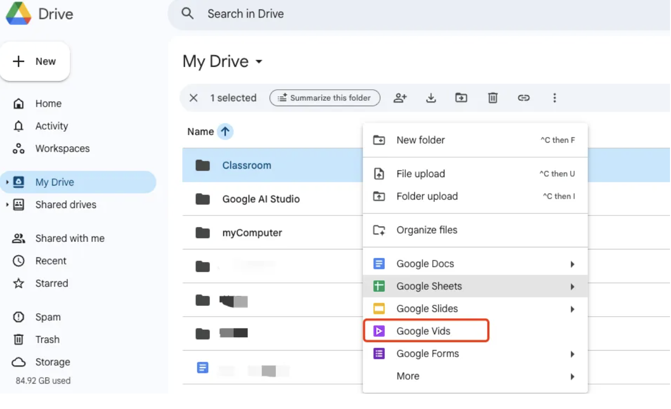 你可以在 Google Drive 里右键创建 Google Vids, 也可以直接访问链接:https://docs.google.com/videos/u/0/