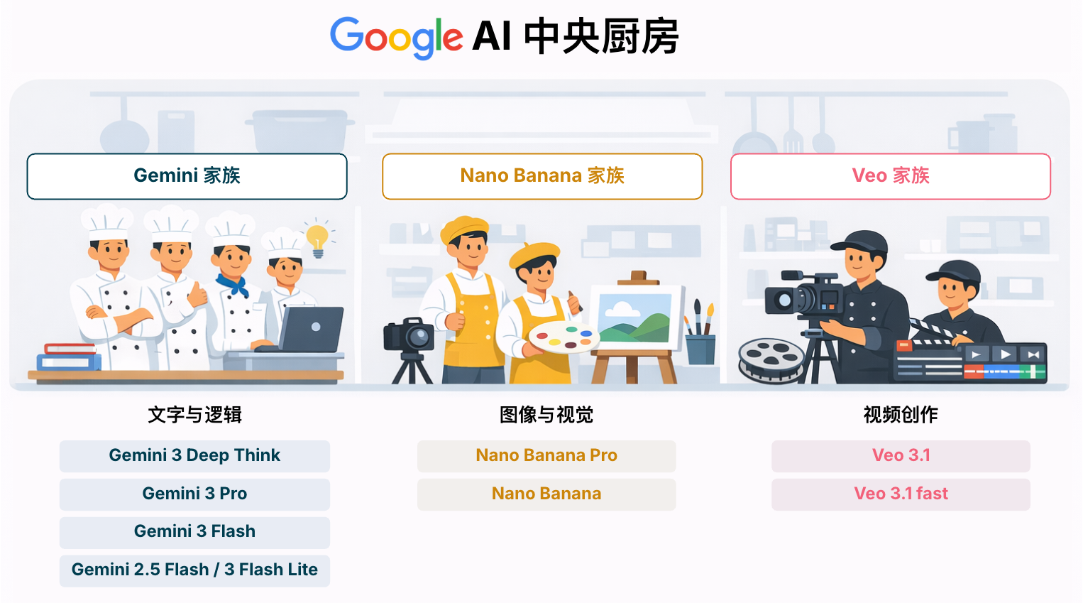 在谷歌的世界里,真正决定 AI 能力上限的,并不是某个产品界面,而是藏在后台的底层模型(LLM)。它们就像中央厨房里的厨师团队,决定了菜能不能做好、好到什么程度。