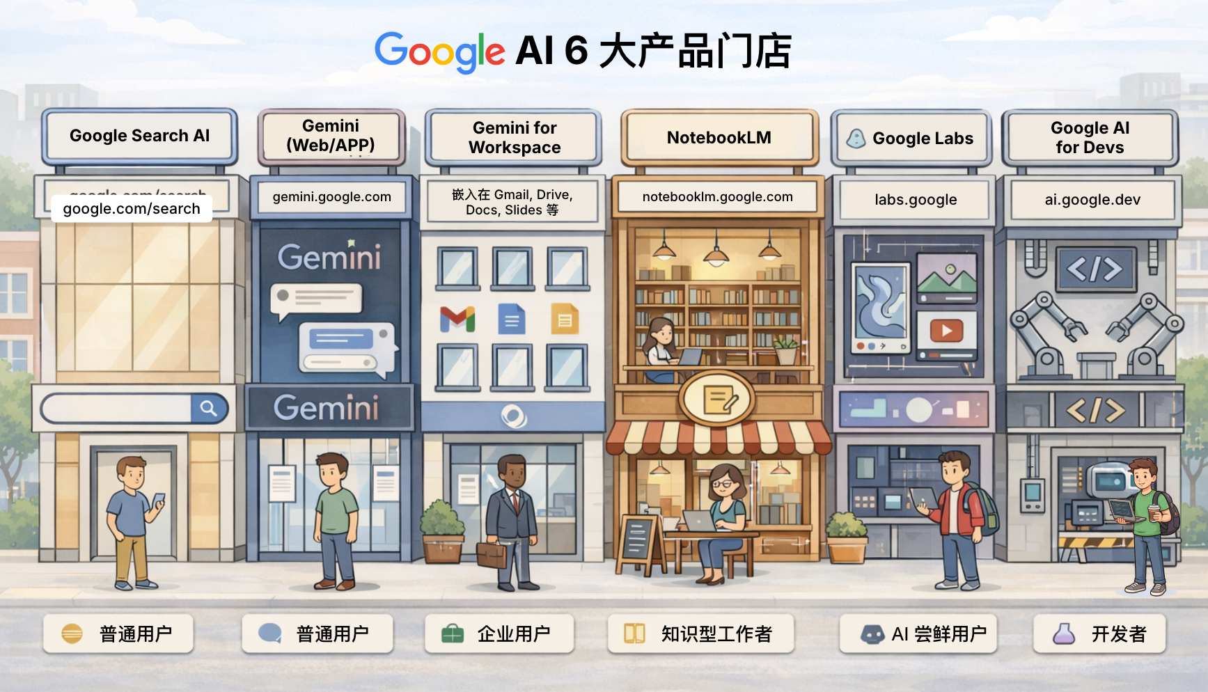 - 产品层(连锁门店):这是你真正接触谷歌AI的地方。谷歌 AI 餐饮集团有多个不同的门店:有面向所有人的“旗舰店”(Gemini Web / App),有专注办公场景的“写字楼店”(Gemini for Workspace),也有只做深度阅读和研究的“主题店”(NotebookLM)等。