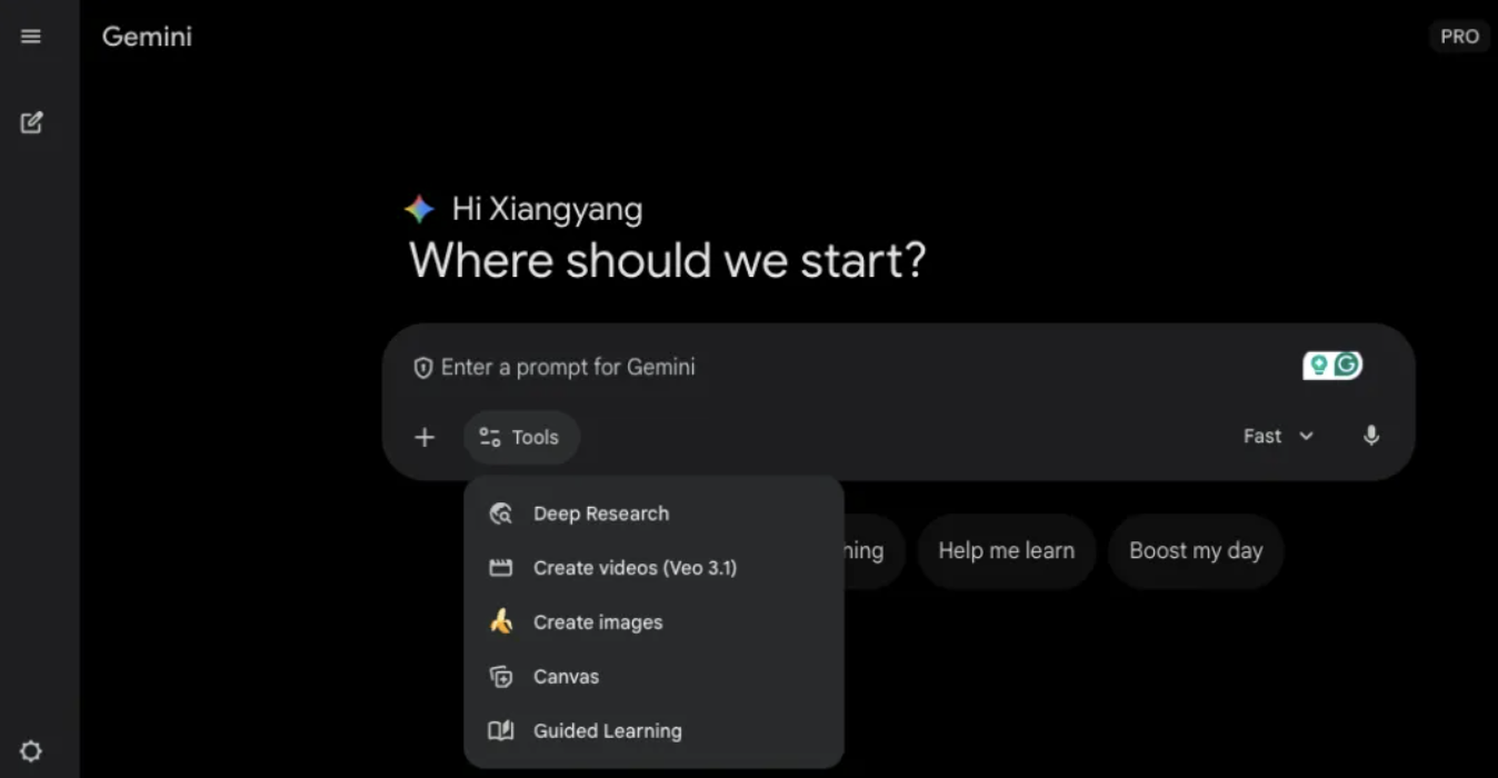 在使用体验上,Gemini 有一个很重要的特点:你可以主动选择某个工具,也可以什么都不选。系统会根据你的指令,在后台自动调度最合适的模型和工具组合。
