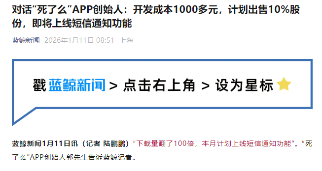 真正的转折点来自权威媒体的介入。1月11日早8点51分,蓝鲸新闻率先发布相关报道,且无后续独家采访支撑,后续各类媒体的报道均以此为蓝本进行二次创作,形成了统一的传播口径,让“死了么”彻底走出社交平台的小圈子,实现破圈走红。