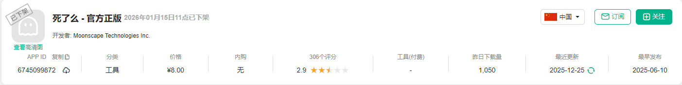 2026年1月15日11时许,“死了么”APP突然从国内应用商店下架,此前并无任何前兆。