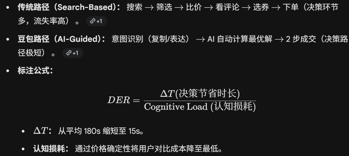 - 豆包链路(生成式):用户复制链接/意图表达 -> AI 自动计算最优解 -> 2 步成交(决策能效比 DER 的质变)。