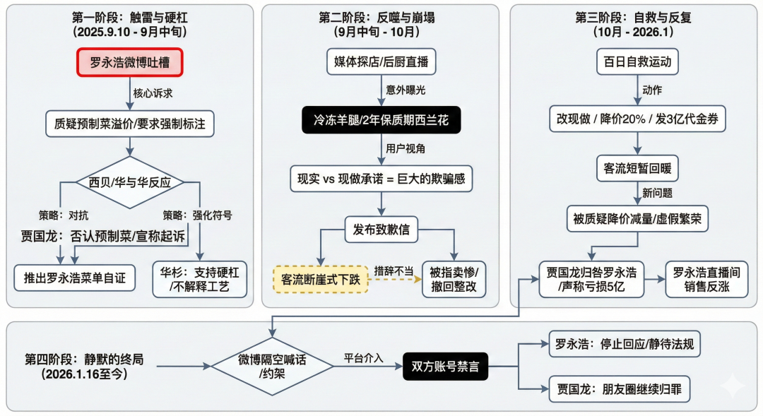 很快,西贝方面做出了强硬回应。创始人 贾国龙 公开否认使用预制菜,这一否认基于国家对“预制菜”的正式定义,从法律层面看并非站不住脚。同时,西贝宣布将起诉罗永浩,并推出所谓的“罗永浩菜单”,试图以正面进攻的方式完成自证。与此同时,营销咨询公司华与华的创始人华杉也公开力挺,鼓励“硬杠到底”。