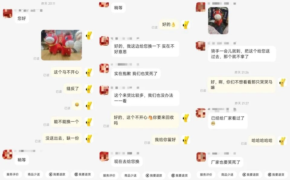 这款名为“笑笑马”的玩偶,是张火清为马年量身打造的爆款备选,非常契合春节的喜庆寓意。但由于工人的失误,一部分货品的嘴巴被缝反,变成了委屈巴巴的“哭哭马”。张火清并未犹豫,迅速承诺退换货,并在心里盘点仓库滞销的“哭哭马”数量。没想到正准备点击发送消息时,经销商却打出了令她意外的话,“有消费者点名要哭脸马,能不能订一批货试试?”