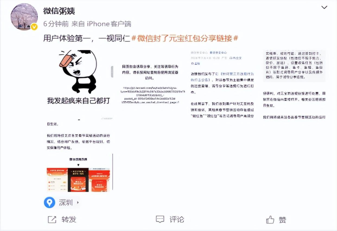 微信公关总监“粥姨”发文表示:“用户体验第一,一视同仁。”并配上了一张表情包“我发起疯来自己都打。”