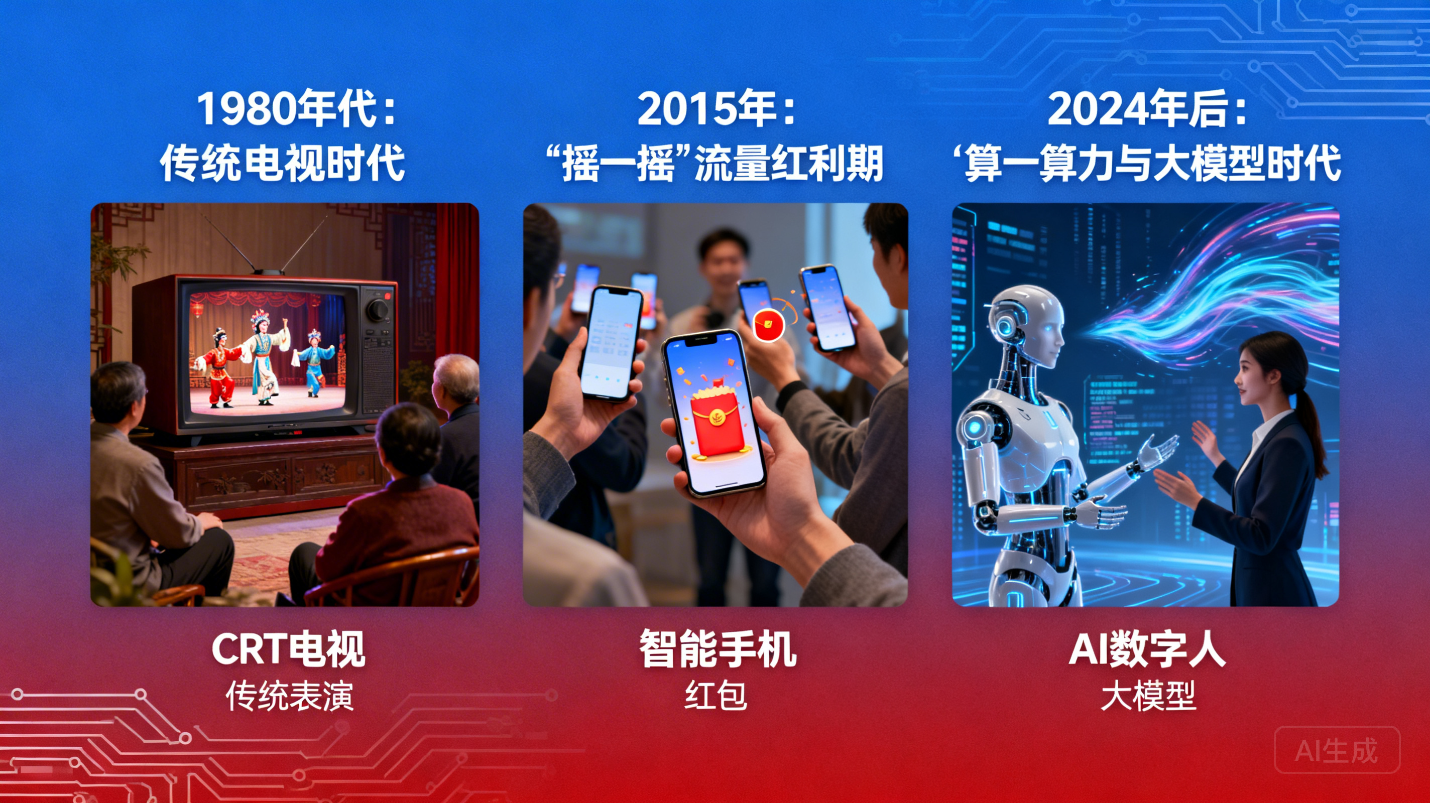 从全民“摇一摇”到AI“算一算”,春晚这个国民级舞台正在见证一场深刻的技术革命。2026年的除夕夜,人们不再争抢红包,而是用豆包生成贺图、创作春联,互动逻辑从“流量争夺”升级为“内容生成”。本文深度剖析春晚从“最大流量池”到“顶级技术试验场”的定位跃迁,揭示背后百万倍算力跨越的硬核架构,以及从单点广告到生态协同的商业进化,为互联网从业者指明AI时代的战略坐标。