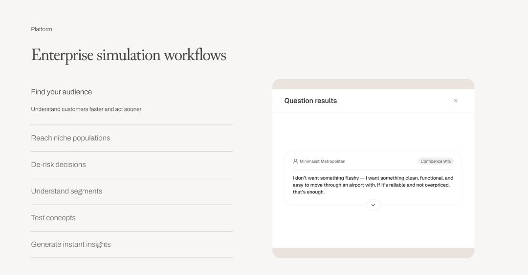 但应用远不止于零售。Simile的客户正在用这个平台做各种各样的事情:预演财报电话会议、模拟诉讼结果、测试政策变化。想象一下,如果你是一家上市公司的CEO,即将面对季度财报电话会议。分析师会问什么问题?投资者会关注哪些指标?你的回答会引发什么反应?传统上,公司会依靠经验丰富的投资者关系团队来准备,但再有经验的团队也无法预见所有可能的问题。而Simile可以模拟出数百个可能的场景,让你在真正面对分析师之前就做好充分准备。