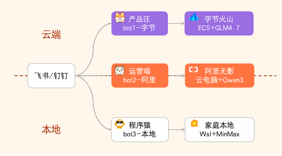 一个App里,字节火山引擎的"产品汪"帮你操作飞书文档,阿里无影的"运营喵"抓取热点写推送,本地Linux的"程序猿"管理私有代码库——三个AI助手各司其职,而你只需在飞书里@它们。这不是未来场景,而是OpenClaw承诺的"电子牛马"现实。但前提是,你能搞定复杂的渠道适配、凭证配置和API替代。本文提供飞书+火山/无影的完整安装链路,6步完成从0到1的部署。
