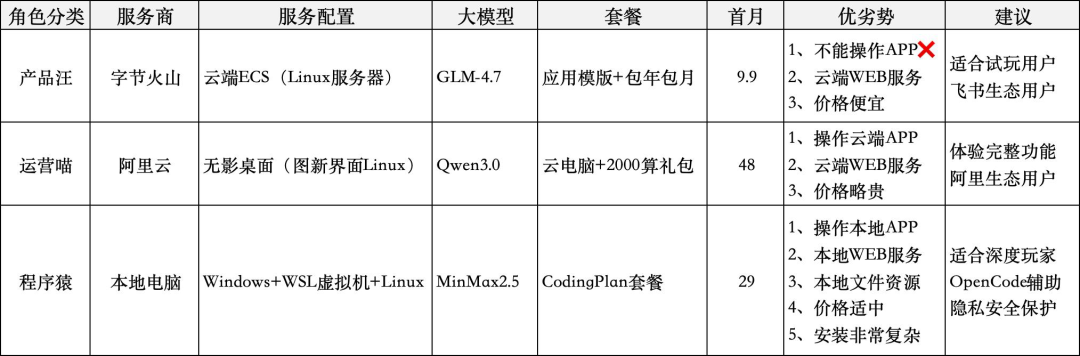 1)字节火山:这套安装方案采用的“云端服务器+流量包套餐”的模式,价格也是最便宜的。并且有字节的飞书生态支持,非常适合想快速体验下OpenClaw的用户。美中不足的是不能操作浏览器和各种应用,不过9.9的价格还要啥自行车呢。