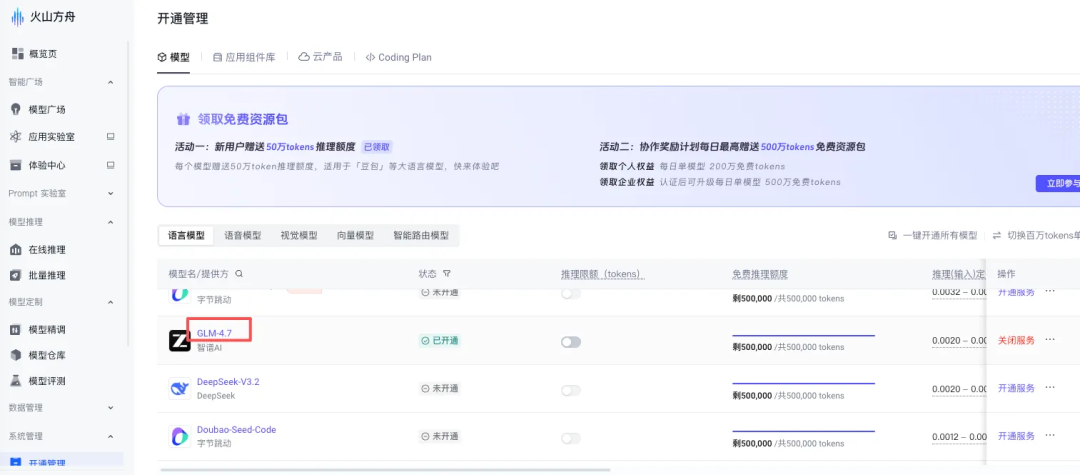 #点击:火山方舟-开通管理