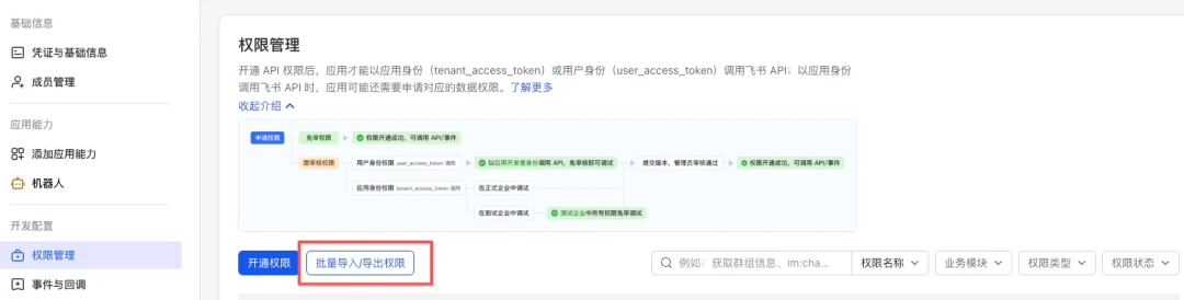 这里需要开通机器人消息和文档权限,我们直接选择【批量导入/导出权限】