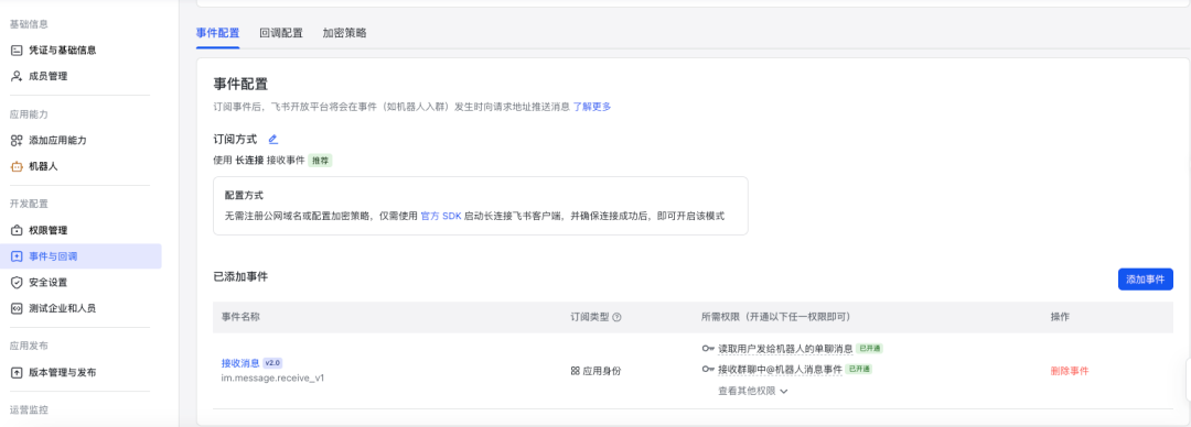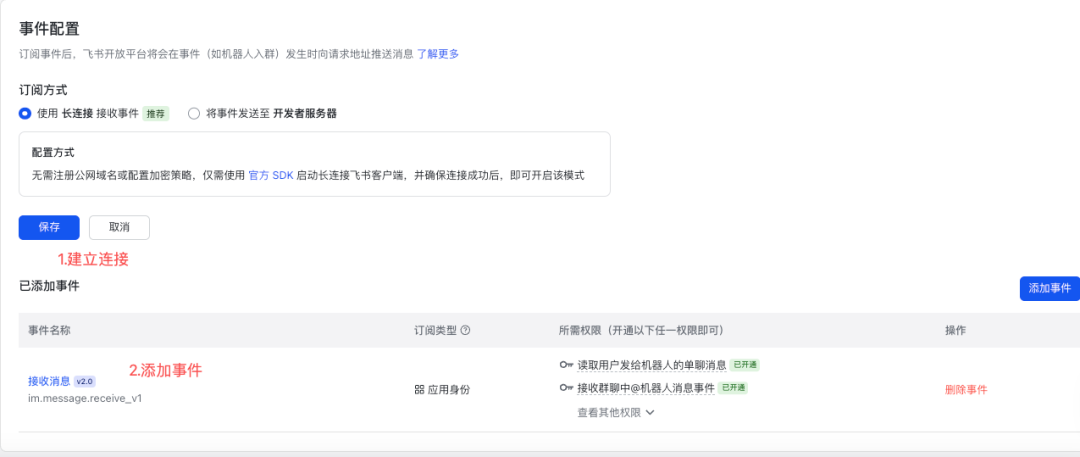 2)飞书平台建立连接在飞书平台【事件配置】中建立连接和添加事件。