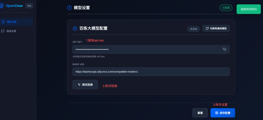 回到“无影云电脑”,复制API-Key后完成测试,最后进行保存,这样模型配置就生效了。