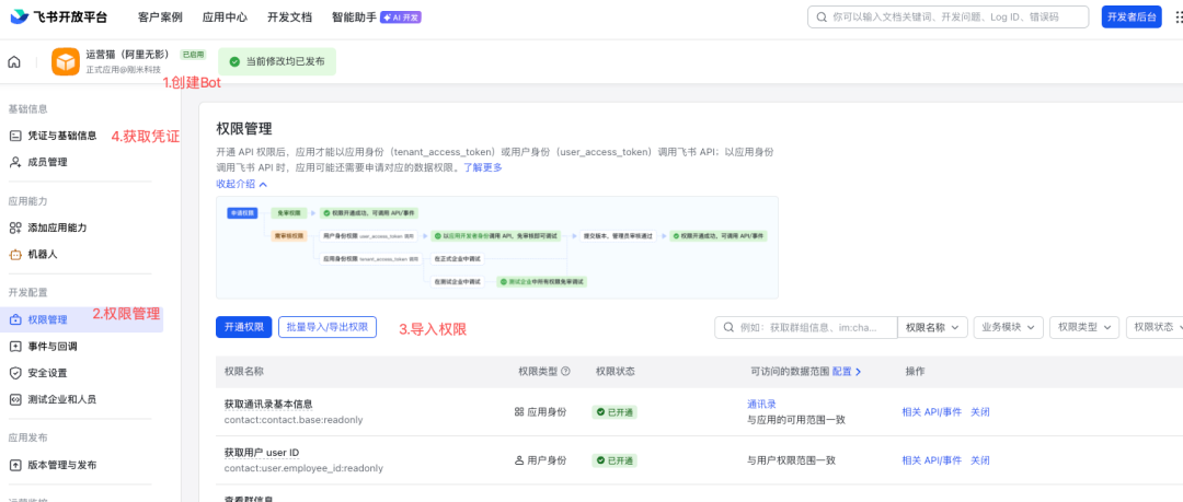 下面我们来创建飞书上的“运营喵”Bot配置,这个过程与飞书设置相同【创建机器人—权限管理—导入权限—获取凭证】四个步骤,随后回到“无影云电脑”建立连接。