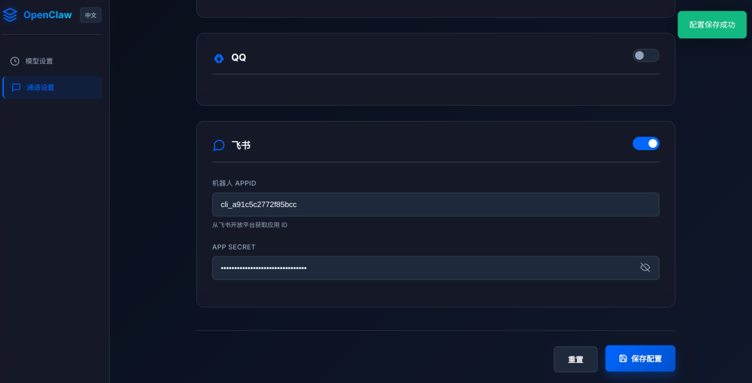 从图2我们可以看到,你在App上设置一个机器人(Bot),需要给OpenClaw一个凭证来绑定对应的适配器。