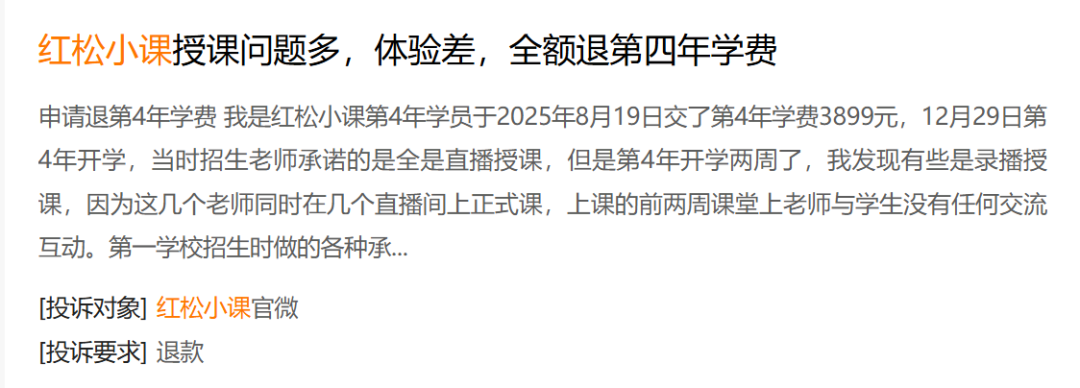 “收割”共识之下,行业乱象也逐渐滋生。去年“315”期间,《北京青年报》就报道了老人被兴趣岛销售诱导开花呗分期购买9580元太极课事件。而即便是红松小课,在黑猫平台上也有不少投诉消息,包括招生时承诺全直播授课,结果有一些是录播课、课程质量与宣传时不符、课程退费难等问题。