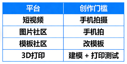 短视频平台只需手机拍摄即可完成创作,图片社区同样依靠手机拍摄就能产出内容,模板类社区更是只需简单修改模板就能生成作品,而3D打印不仅需要掌握建模技能,还需要完成打印测试和修改优化。其中,建模环节本身就对创作者提出了很高的要求,需要熟练运用CAD、Blender、SolidWorks 等专业建模软件,这些软件的学习成本高、操作难度大,让很多普通爱好者望而却步,难以形成吸引用户持续留存的内容生态。