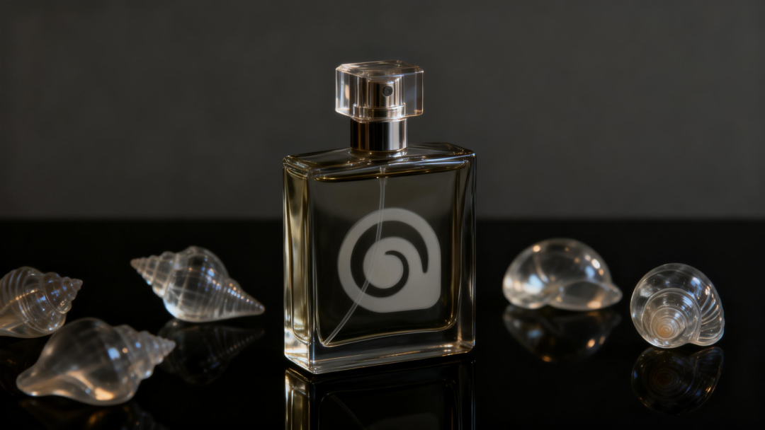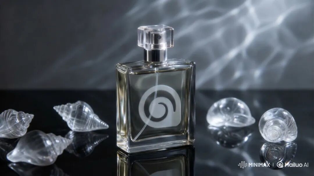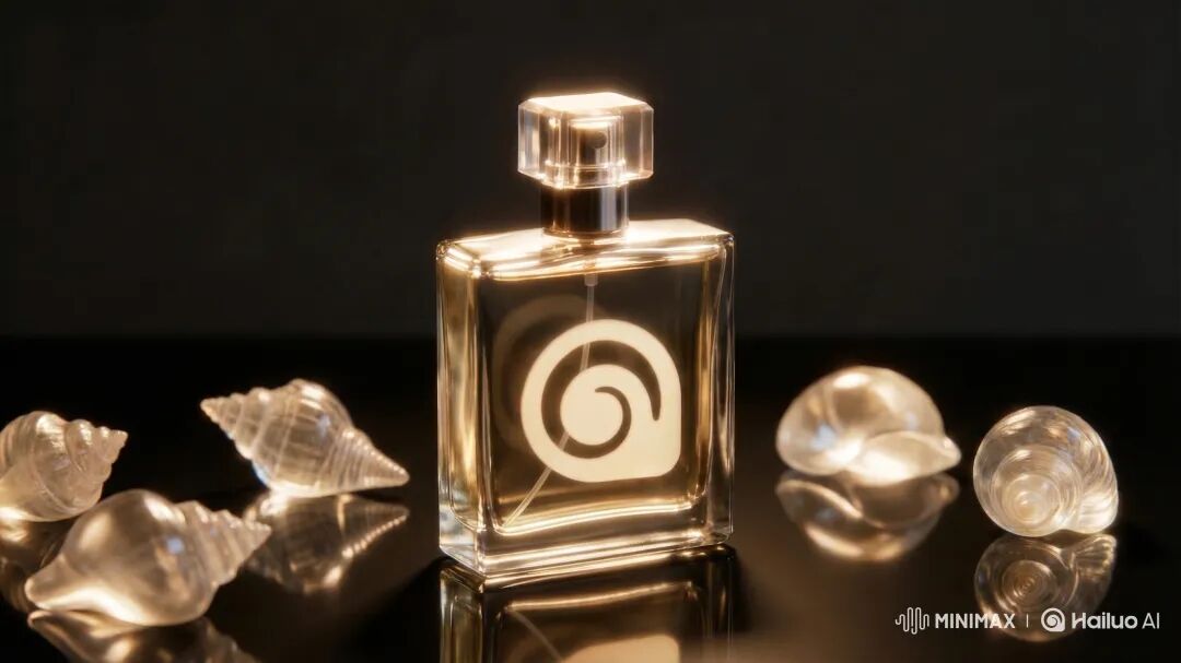 香水瓶上的海螺 Logo 再加上周围散落的海螺,这种布光方式营造出一种产品置沉在水底的错觉,看到的时候会联想到产品与海洋、自然的关系。