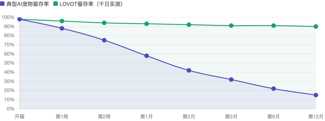 如果把这件事画成留存曲线,就会发现一个更直观的问题:多数产品在第二个月前后就开始明显掉队,而LOVOT的长期留存却几乎贴着高位在走。两条线之间的距离,本质上就是“情绪陪伴”和“情感陪伴”的距离。