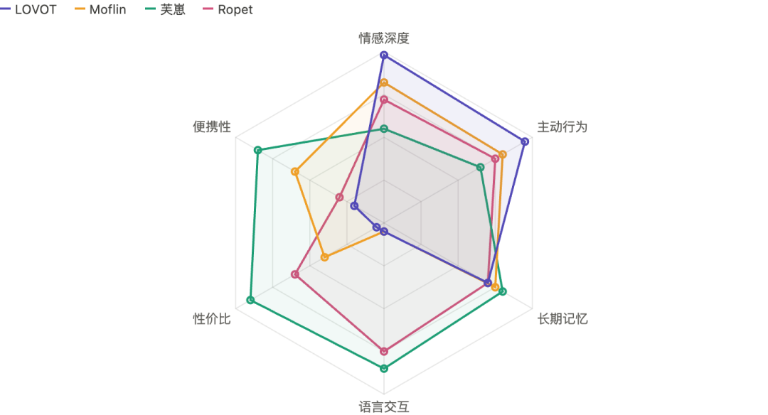 雷达图清晰呈现了四款产品的能力分布:LOVOT在情感深度和主动行为上遥遥领先,但语言交互和性价比几乎为零;芙崽在记忆和语言上很强,但情感深度还有很大的提升空间;Ropet是相对最均衡的。